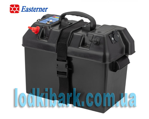 Верхняя крышка оснащена ручкой для переноски, наружными клеммами и световым индикатором заряда аккумулятора. Индикатор можно отключать. Сама крышка фиксируется к боксу ремнем (идет в комплекте). Клемы оснащены пластиковыми гайками типа барашек